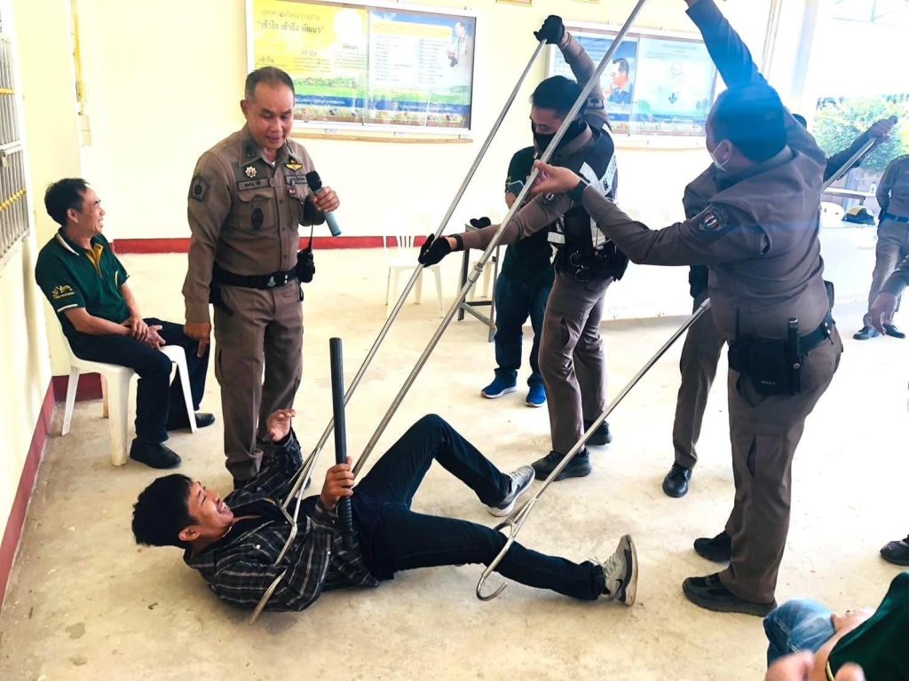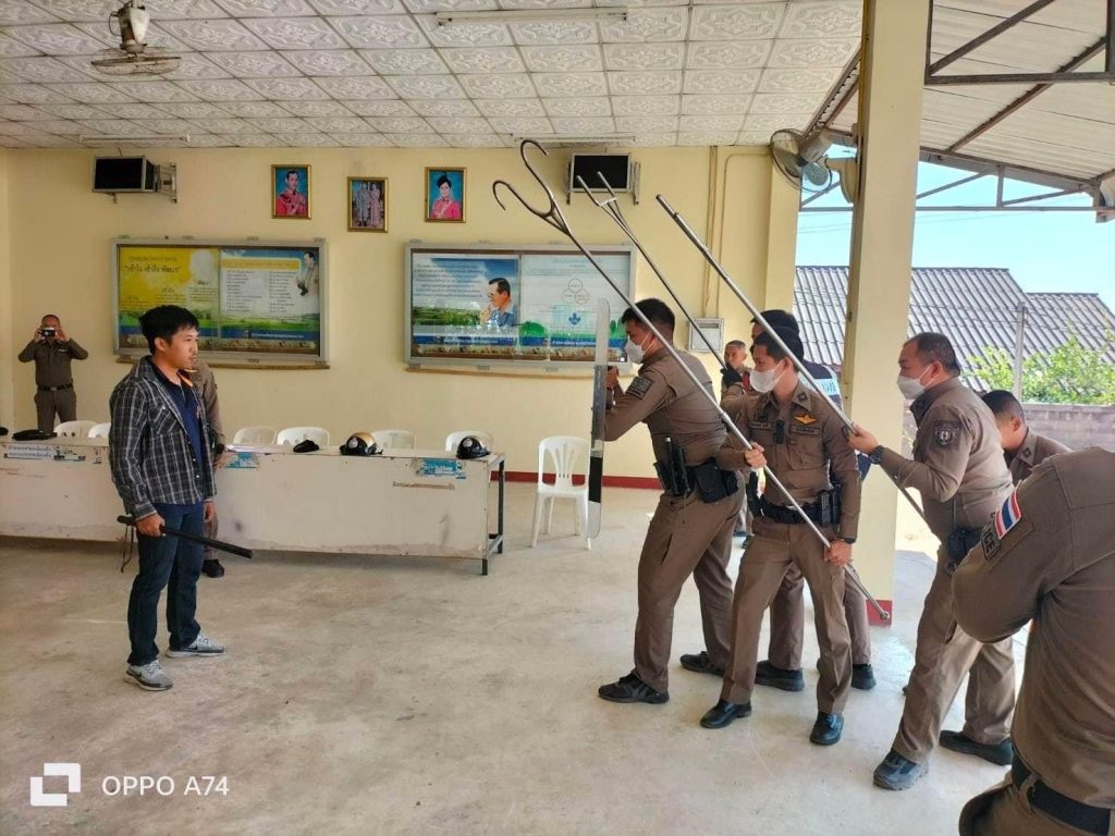 นำกำลังชุดปฏิบัติการยุทธวิธีการใช้ไม้ง่ามในการระงับเหตุ ทำการฝึกอบรมให้ความรู้เกี่ยวกับยุทธวิธีการเข้าระงับเหตุบุคคลคลุ้มคลั่งโดยใช้ไม้ง่าม ให้กับผู้นำชุมชนในเขตพื้นที่ตำบลข่วงเปา อ.จอมทอง โดยมี นายจรัญ คำวงศ์ศา กำนันตำบลข่วงเปา นำผู้ใหญ่บ้านและผู้ช่วยผู้ใหญ่บ้าน หมู่ที่ 1,2,3,10,12,13,14,15 ตำบลข่วงเปา จำนวน 40 คน เข้ารับการอบรม ณ หอประชุมประจำหมู่บ้านหนองห่าย หมู่ที่ 1 ตำบลข่วงเปา อำเภอจอมทอง จังหวัดเชียงใหม่