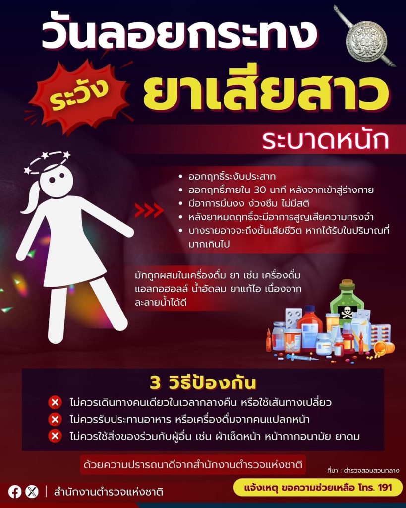 ตำรวจสอบสวนกลาง (CIB) เตือนภัยถึงอันตรายของยาเสียหนุ่ม เสียสาว ที่อาจถูกคนร้ายนำมาใช้ในช่วงเทศกาลลอยกระทง