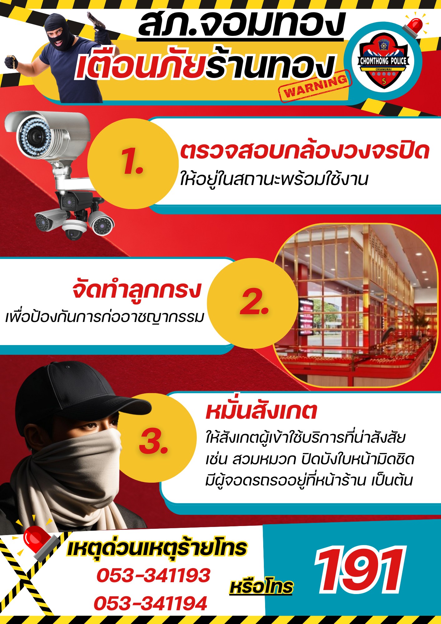 สภ.จอมทอง เตือนภัยผู้ประกอบการร้านทอง เนื่องด้วยสภาพเศรษฐกิจและสังคมในยุคนี้ เสี่ยงต่อการก่ออาชญากรร